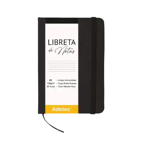 LIBRETA COSIDA A6 NEGRA CON ELÁSTICO ¡Registra tus ideas y apuntes en nuestras libretas ! Contiene 80 hojas de 100 g/m, extra suaves de color Ivory, con líneas horizontales.