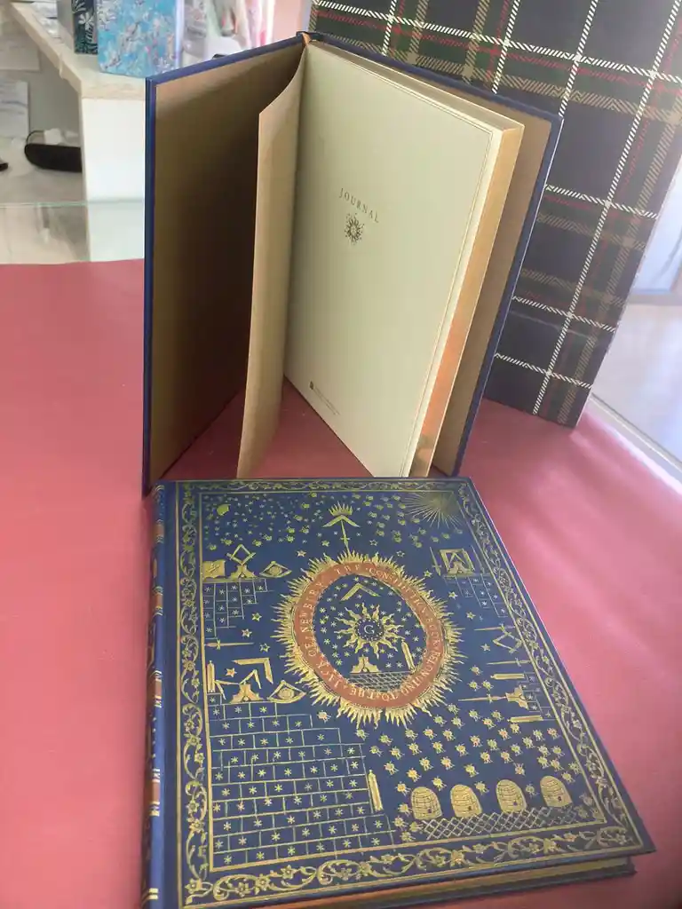 Libreta grande, basada en la constitución masón del siglo 18 de Inglaterra, borde de las hojas en folia dorada. Medidas 23x19 centímetros.