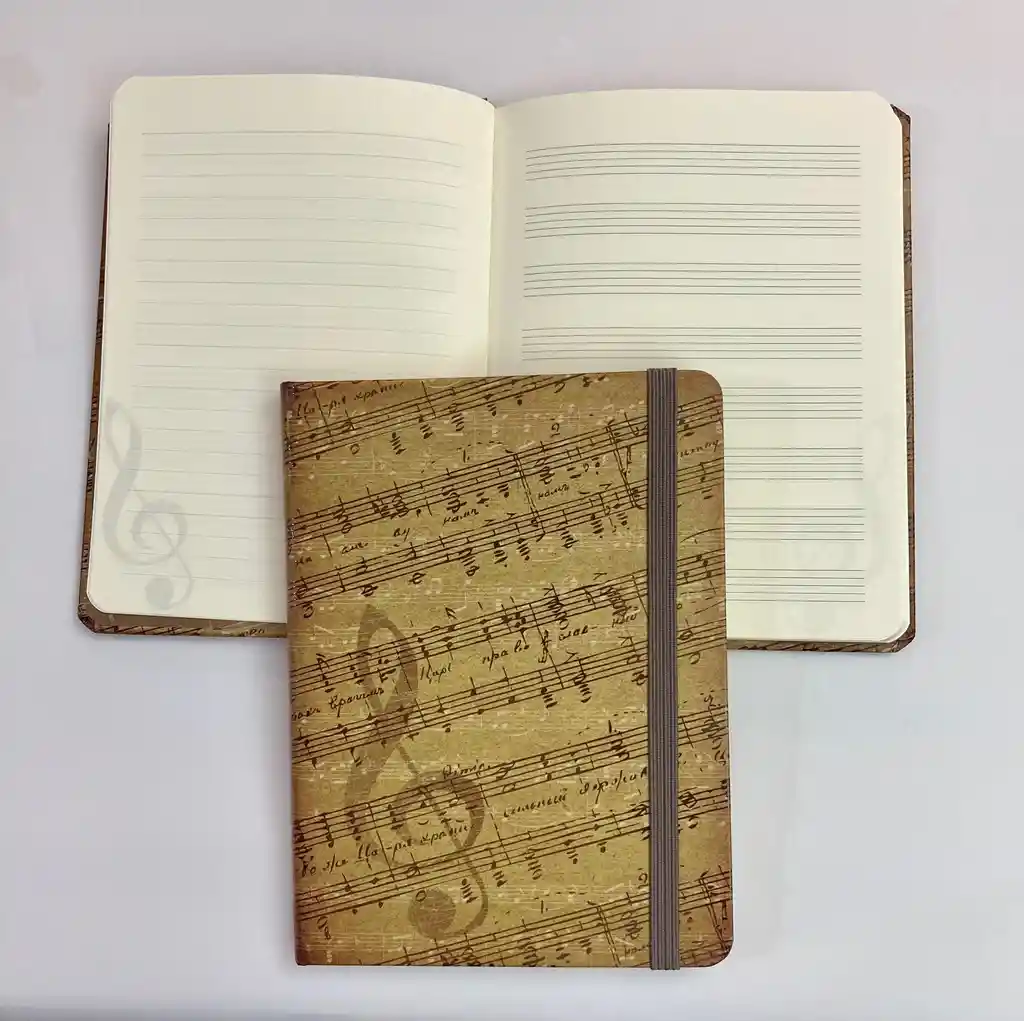 Libreta mixta con hojas alternadas en formato de composición (líneas) y pentagrama musical. Tapa dura con relieves y texturas que le dan un toque de elegancia clásica.