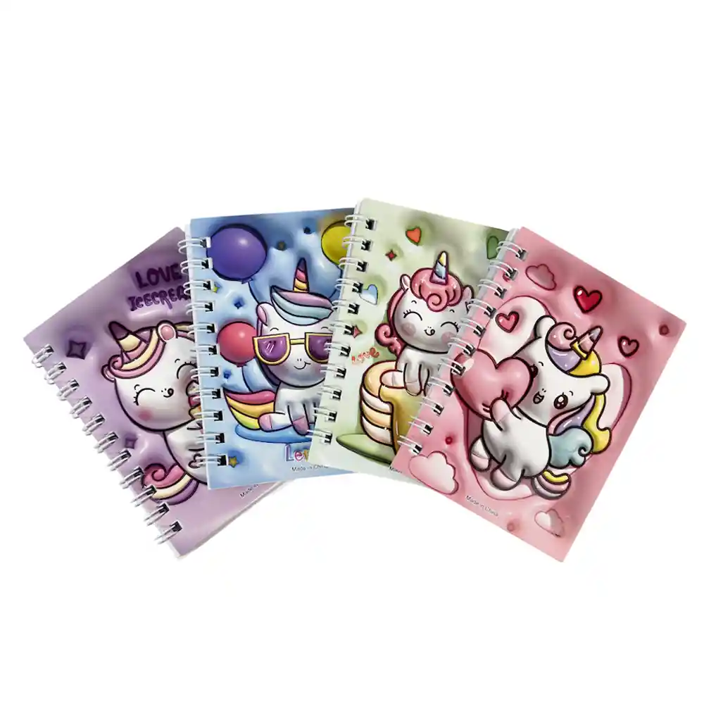 📋 Detalles técnicos Tipo de producto: Libreta anillada infantil Tema: Unicornios Cantidad: 4 unidades por pack Diseños: Surtidos (se envían modelos variados) Uso recomendado: Notas, dibujos, recuerdos de fiesta, premios y uso escolar