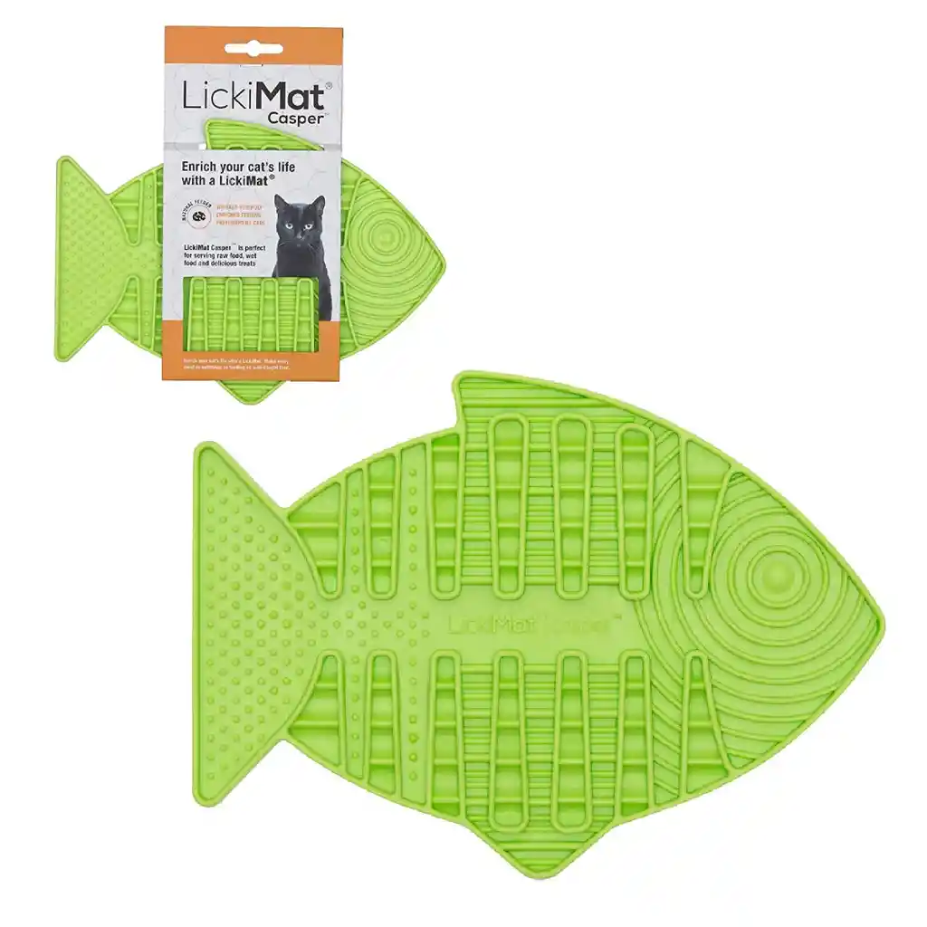 Divertido diseño de Pez con espinas, LickiMat Casper enriquecen el tiempo de alimentación de los gatos al permitir una mayor actividad, como la experiencia en la naturaleza. Están diseñados para complacer su lengua y para trabajar con todo tipo de golosinas. La acción de lamer genera saliva que ayuda a proteger los dientes y las encías de su mascota y puede ayudar a la digestión, ya que la saliva contiene enzimas como la amilasa. La superficie de caucho natural tambíen raspa las particulas de comida y las bacterias que causan el olor de la lengua de su mascota, lo que promueve un aliento más fresco. El LickiMat tambien se puede utilizar para promover una alimentación más lenta, lo que a su vez reduce la hinchazón y mejora la digestión. Es una gran alternativa a los comederos lentos. Incluso puede vongelar alimentos y golosinas en el tapete para una alimentación más lenta y agradable.
