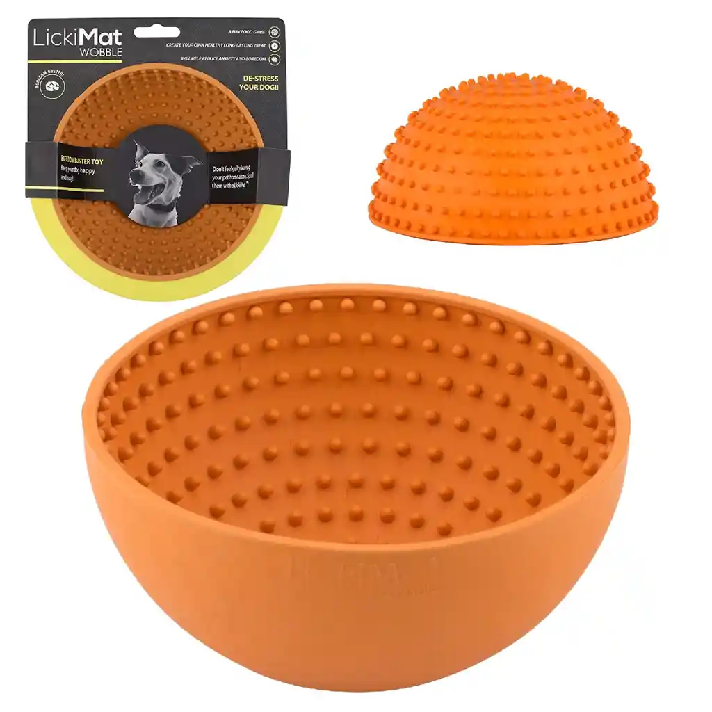 Diseño redondo, La magia de LickiMat Wobble es que desafía a su perro a lamer la golosina y la comida para ser recompensado. Esto relentiza drásticamente el proceso y prolonga su disfrute con menos calorías ya que la acción de "bamboleo" promueve una diversión extra!. La acción de lamer genera saliva que ayuda a proteger los dientes y las encías de su mascota y puede ayudar a la digestión, ya que la saliva contiene enzimas como la amilasa. La superficie de caucho natural tambíen raspa las particulas de comida y las bacterias que causan el olor de la lengua de su mascota, lo que promueve un aliento más fresco. El LickiMat tambien se puede utilizar para promover una alimentación más lenta, lo que a su vez reduce la hinchazón y mejora la digestión. Es una gran alternativa a los comederos lentos. Incluso puede vongelar alimentos y golosinas en el tapete para una alimentación más lenta y agradable.