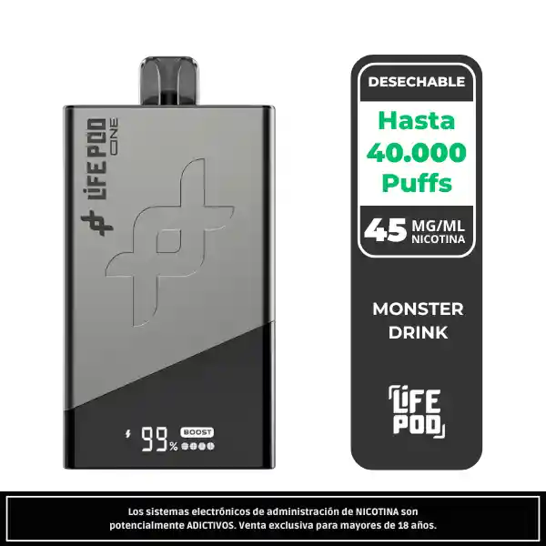 El Life Pod One Monster Drink 40 000 Puffs ofrece un frescor puro y sostenido en cada calada. Con 4,5 % de nicotina, modo Boost ICE / Boost Flavor y pantalla digital integrada, este pod desechable recargable redefine la experiencia mentolada con hasta 40 000 puffs de sabor intenso y limpio.