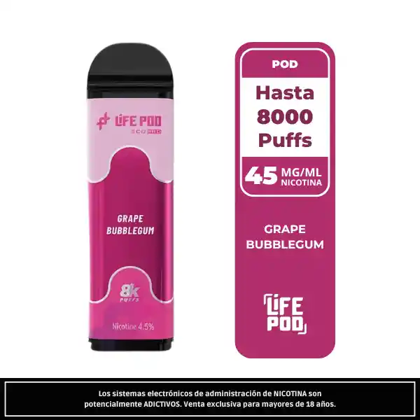 Mezcla el sabor dulce y jugoso de la uva con el clásico toque de bubblegum. Con 4,5 % de nicotina y hasta 8 000 caladas, ofrece una experiencia frutal dulce, aromática y divertida. Compatible con la Batería Life Pod Eco Pro.