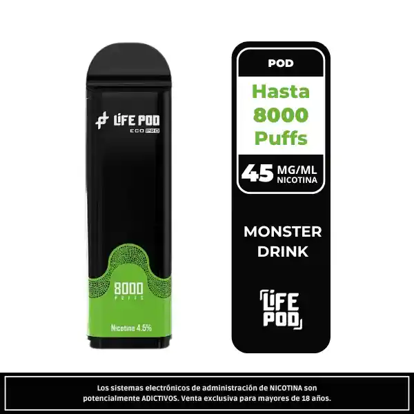 El Life Pod Recarga Monster Drink 8 000 Puffs ⚡ ofrece un sabor tipo bebida energética, dulce, cítrica y refrescante. Con 4,5 % de nicotina y hasta 8 000 caladas, entrega un perfil intenso y vibrante. Compatible con la Batería Life Pod Eco Pro.