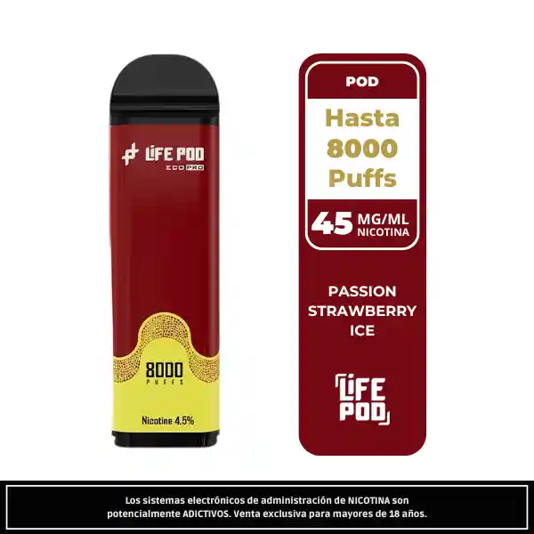 El Life Pod Recarga Passion Strawberry ICE 8 000 Puffs mezcla frutilla dulce y maracuyá tropical con un toque helado refrescante. Con 4,5 % de nicotina y hasta 8 000 caladas, ofrece un perfil frutal vibrante, ácido y dulce a la vez. Compatible con la Batería Life Pod Eco Pro.