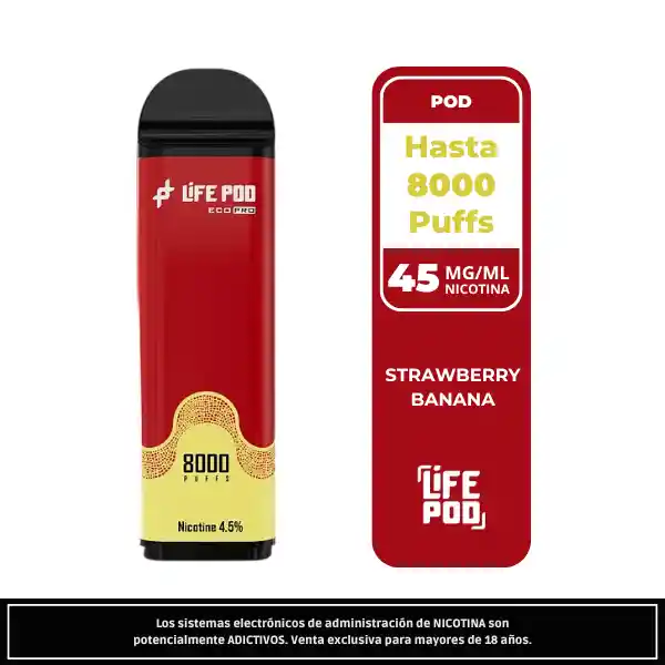 El Life Pod Recarga Strawberry Banana 8 000 Puffs combina frutilla dulce y fresca con el toque cremoso del plátano. Con 4,5 % de nicotina y hasta 8 000 caladas, ofrece un sabor suave, equilibrado y muy agradable. Compatible con la Batería Life Pod Eco Pro.