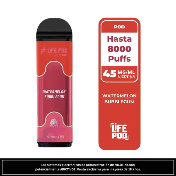 Combina el sabor dulce y jugoso de la sandía con el clásico toque de bubblegum. Con 4,5 % de nicotina y hasta 8 000 caladas, ofrece una experiencia frutal dulce, refrescante y aromática. Compatible con la Batería Life Pod Eco Pro.