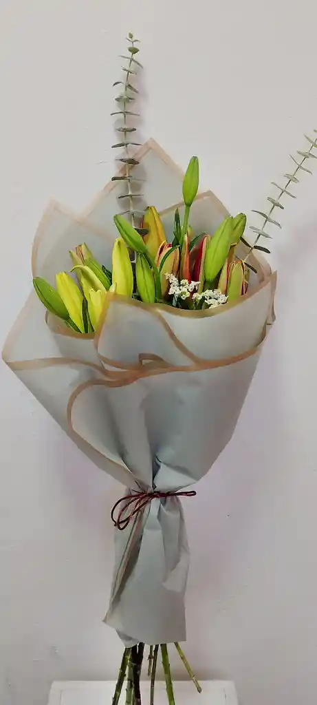 incluye: - 5 Varas de Lilium, ( destacamos que los lilium van en botón para sus mejor transporte y durabilidad ) - Follaje de estación