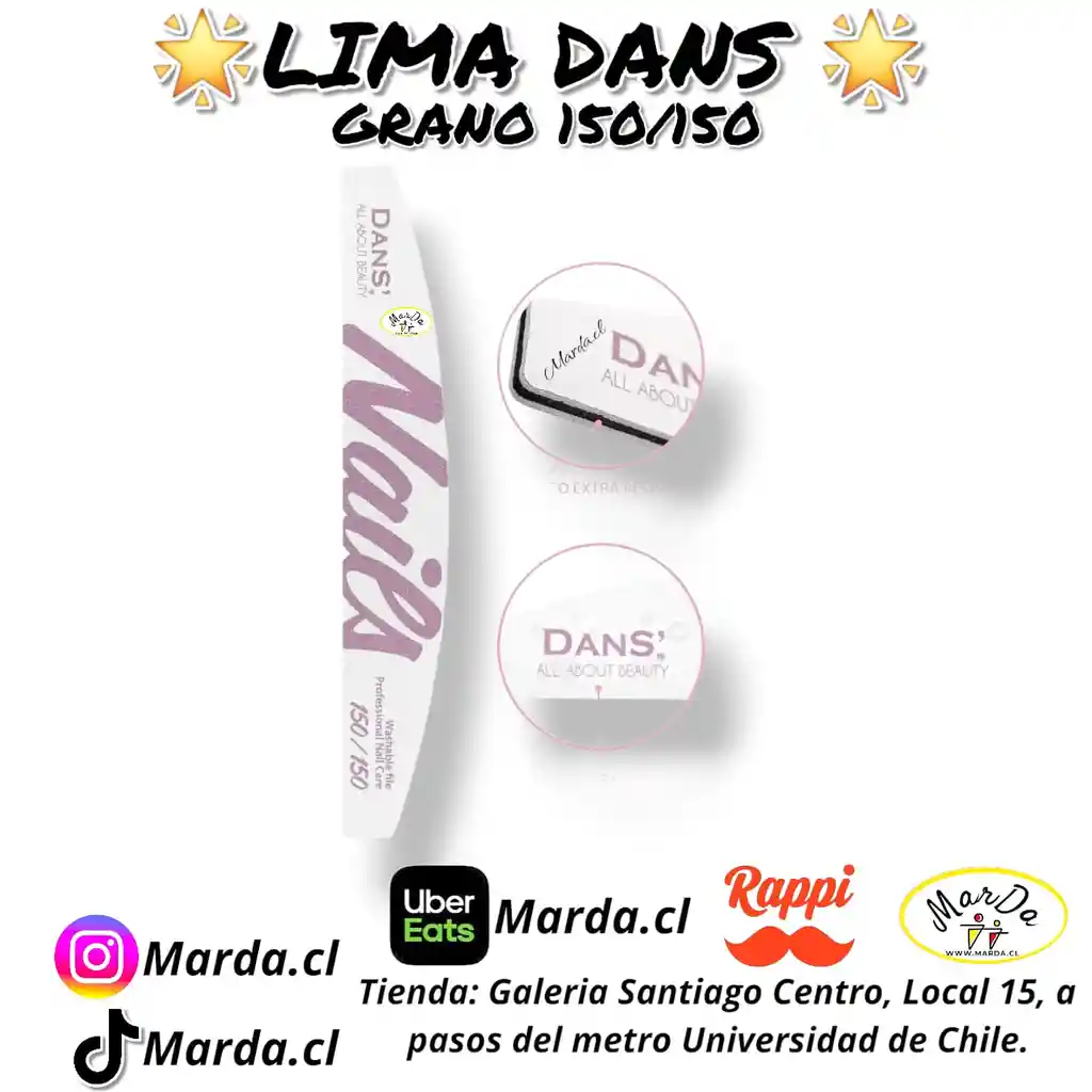 Lima Dans de grano #150/#150, Grano medio, para uñas artificiales (acrílicas, Acryl Gel (Poly Gel), Gel, tips, etc), ideal para usos como rebajar uñas muy largas, o generar limado superficial para la preparación de la uña previo a colocación de tips.. Es repelente al agua.