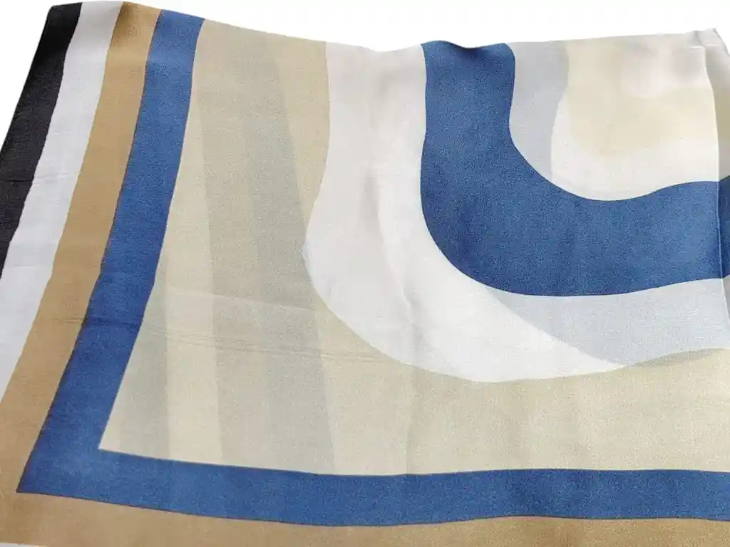 Pañuelo de 70x70 cm con diseño geométrico en tonos azul, beige y blanco. Minimalista, elegante y versátil, ideal para complementar looks modernos y casuales.