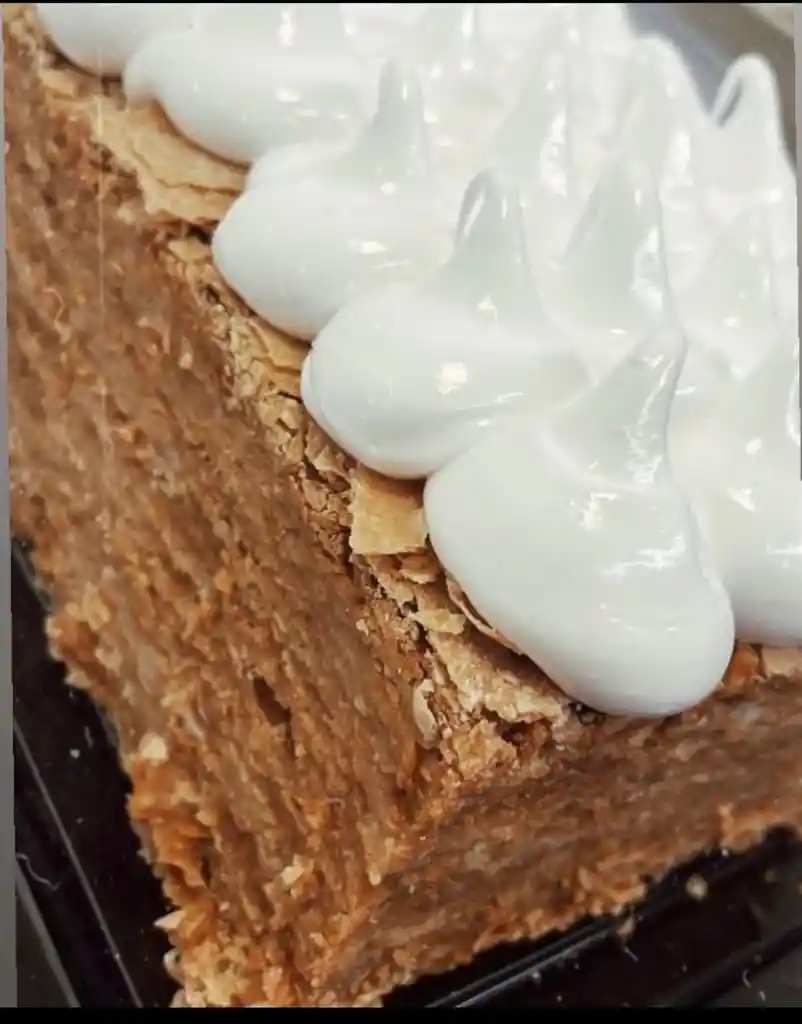 FINAS HOJAS ARTESANALES RELLENAS DE MANJAR Y NUECES, CUBIERTA DE MERENGUE SUIZO