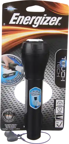 Linterna LED de activación táctil funciona con 2 pilas AA (incluidas). Con tecnología Touch Tech™, no hay interruptor: enciéndelo agarrándola, apágala soltando. Ofrece 20 horas de tiempo de ejecución y 50 lúmenes. Ideal para uso en interiores y exteriores.