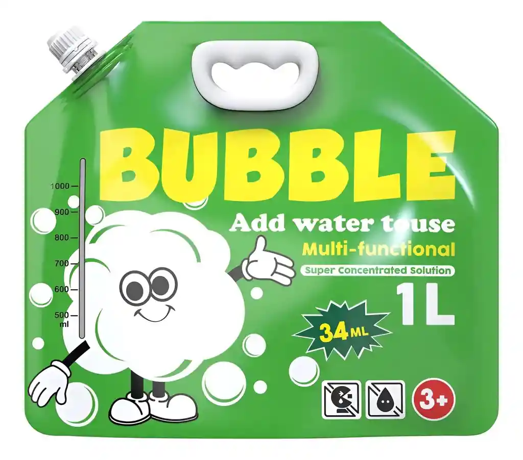 Solución Súper Concentrada para Burbujas 1L (34 ml Concentrado) ¡Diversión garantizada para los más pequeños! La solución es un concentrado multi-funcional diseñado para crear burbujas grandes, resistentes y de larga duración. Características principales: • Súper concentrado (34 ml) – Solo agrega agua para obtener hasta 1 litro de solución lista para usar. • Burbujas más resistentes y brillantes. • Fórmula multi-funcional ideal para pistolas, máquinas y varitas de burbujas. • Indicador lateral de medición para una preparación precisa. • Recomendado para niños 3 años en adelante. • Envase práctico con asa y tapa dosificadora. Ideal para: • Cumpleaños y fiestas infantiles • Juegos al aire libre • Actividades recreativas y eventos • Regalos divertidos y económicos