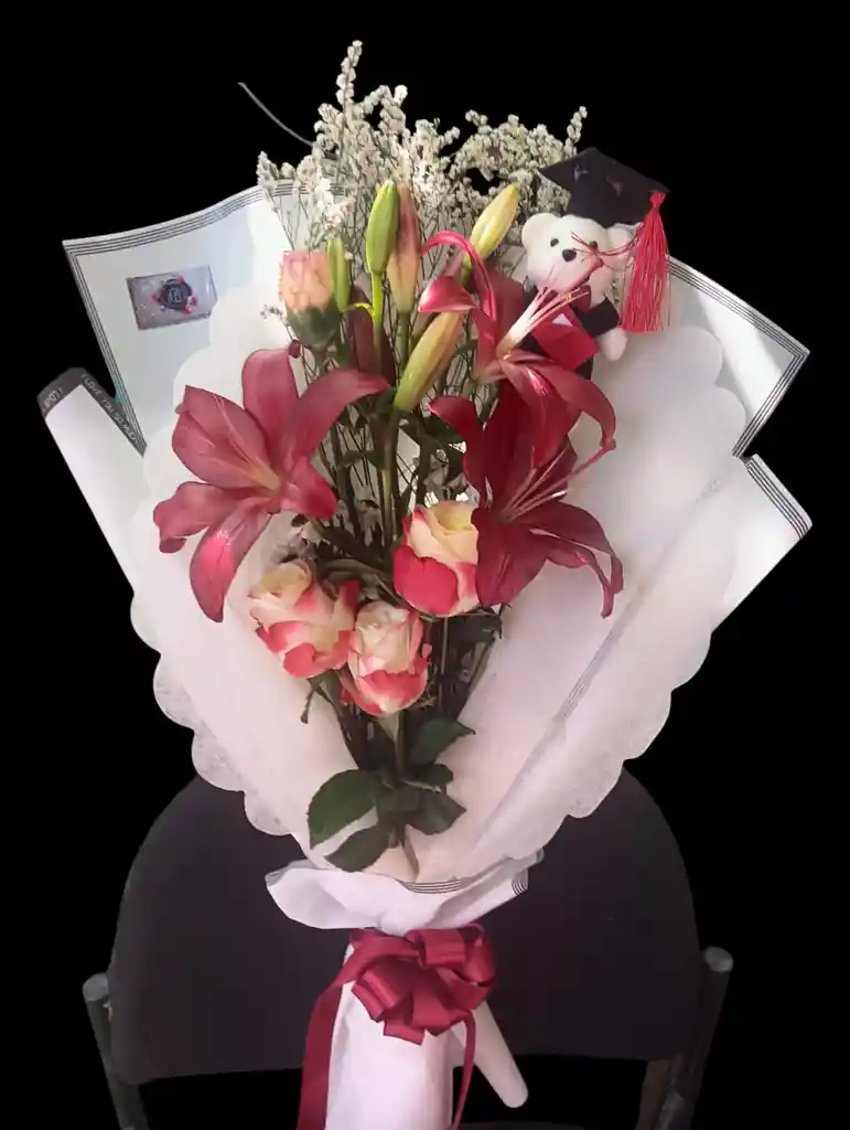 Ramo de Lirium y rosas con claveles de decoración y follaje según estación.