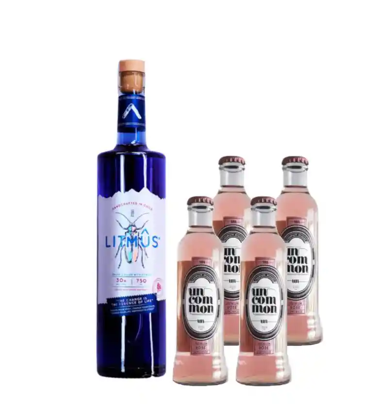 Litmus 750cc + 4x Rose Lemonade Uncommon Mixers 200cc Todo el color de Litmus esta vez con un Mixer especial y al mejor precio Productos chilenos licor Litmus - Rose lemonade agua tónica Uncommon