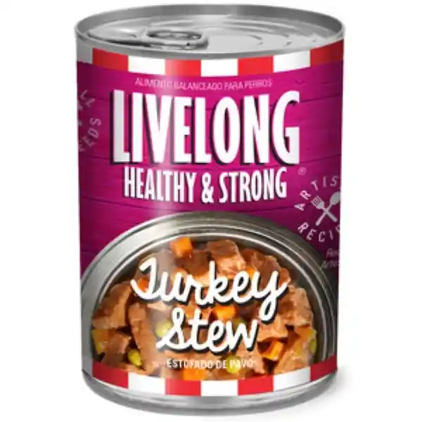 Todas Las Edades. Livelong Healthy & Strong Estofado de Pavo es un Alimento Para Perros Con Alto Contenido de Carne de Pavo Cortado en Pedazos y Contiene un Delicioso Caldo. Contiene Además Vegetales. Es Una Comida Completa Balanceada Natural y Sana Que Proporcionará a su Perro la Mejor e Incomparable Nutrición. No Contiene Granos de Ningún Tipo. Proteína de Alta Digestibilidad Que Provee Todos Los Aminoácidos Esenciales. Para Agregar Valor Nutricional y Una Mejor Fuente de Proteínas Combinamos Nuestra Receta Con Hígado ya Que es Una Excelente Fuente de Vitaminas y Hierro. Sola Fuente de Proteína Excelente Para Perros Con Alergia Alimentaria Específica. Deliciosa Receta de Trozos de Carne en un Sabroso Caldo Que a tu Perro le Encantará. Vegetales Saludables. Sin Gluten Soya Trigo o Maíz. Alto Nivel de Digestibilidad. 100% Natural Sin Sabores Artificiales Colorantes Químicos o Conservadores.