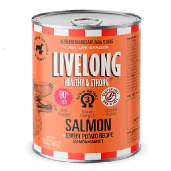 Todas Las Edades. Livelong Healthy & Strong Salmón y Camote es un Alimento 100% Natural Para Perros Con 90% Carne de Salmón y Pescado. Contiene Además Camote y Vegetales Orgánicos. No Contiene Granos de Ningún Tipo. Proteína de Alta Digestibilidad Que Provee Todos Los Aminoácidos Esenciales. Para Agregar Valor Nutricional y Una Mejor Fuente de Proteínas Combinamos Nuestra Receta de Salmón Con Pescado y También Con Hígado ya Que es Una Excelente Fuente de Vitaminas y Hierro. 90% Carne Fresca de Alta Calidad. Vegetales Frescos y Orgánicos. Sin Gluten Soya Trigo o Maíz. Nivel de Digestibilidad Por Encima Del 90% Para Heces Reducidas. 100% Natural Sin Sabores Artificiales Colorantes Químicos o Conservadores.