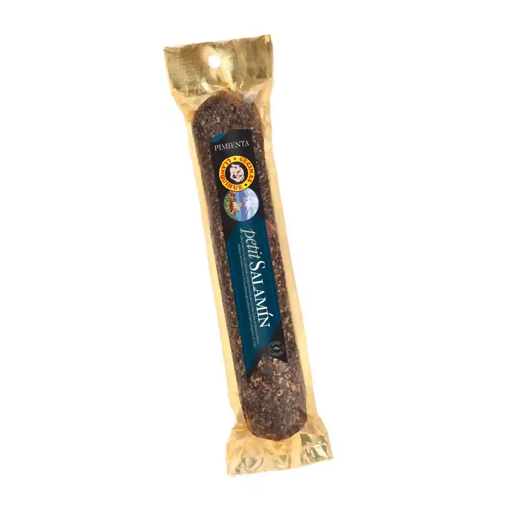 Tiene una cubierta de pimienta verde que le da al salami tradicional un sabor original picante y un aroma especial, su presentación lo hace ideal para disfrutar en cualquier momento del día. packing: Al Vacío