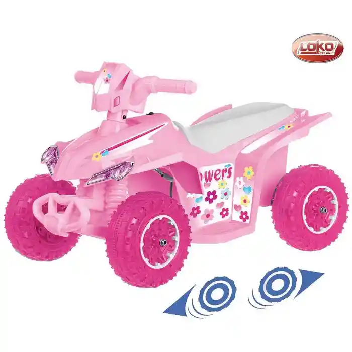 Moto de cuatro ruedas con diseños de florez color rosa.
