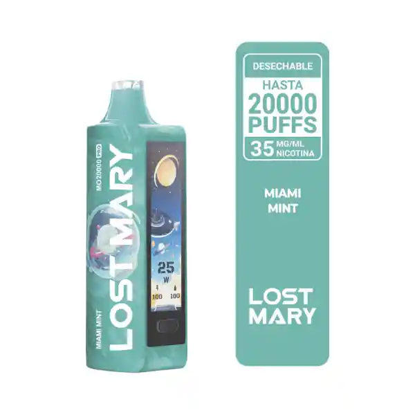 Lost Mary Miami Mint 20.000 Puffs ofrece una frescura mentolada pura e intensa. ¡Pantalla digital, modo Turbo y hasta 20.000 caladas de sabor limpio y potente!