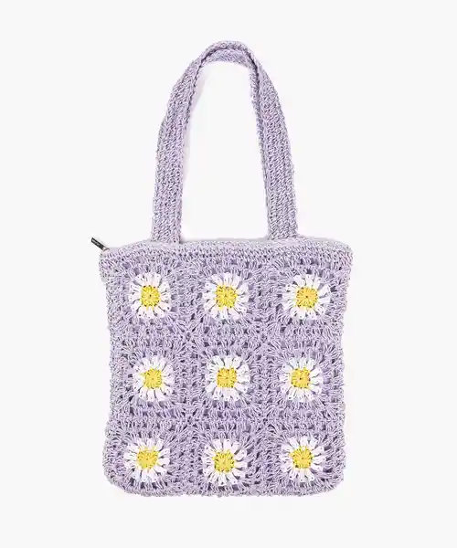 Cartera de Playa Con Flores Tipo Crochet. Se Abre Con Cierre. En el Interior Tiene un Bolsillo Pequeño Abierto.