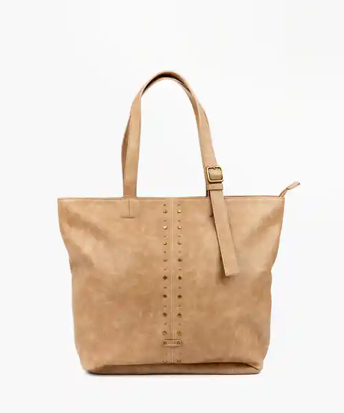 Cartera Color Beige Con Tachas Verticales. El Bolsillo Principal es Con Cierre. En el Interior Tiene un Bolsillo Con Cierre.