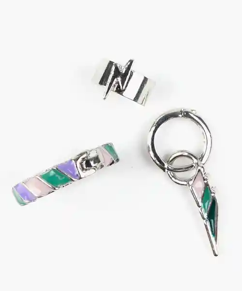 Set Lounge Con 3 Pares. Aros Plateados Una Argolla Con Colores Una Argolla Con Colgante de Rayo y un Cuff Con Rayo.