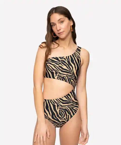 Diseño Brown Zebra Con Escote en un Hombro y Abertura en la Cintura. Tiene Almohadillas Removibles.