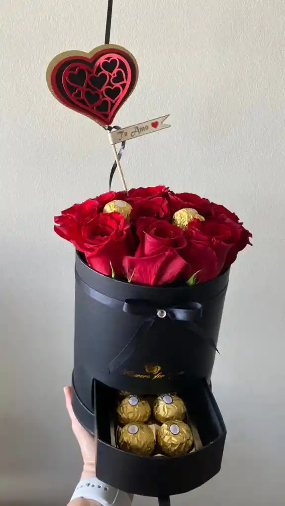 Exclusiva y elegante box gaveta con rosas rojas importadas y deliciosos bombones Ferrero Rocher, adornada con un topper de corazón o "te amo" segun disponibilidad.