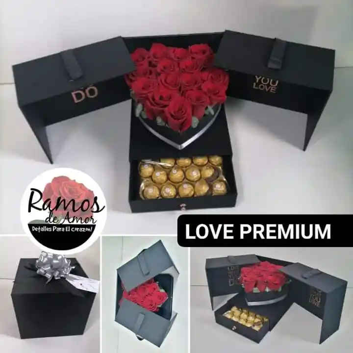 Arreglo en joyero importado sofisticado y con una capa de 18 rosas formando en su nivel superior y en primer nivel 18 bombones ferrero rocher con un diseño sofisticado único y elegante.
