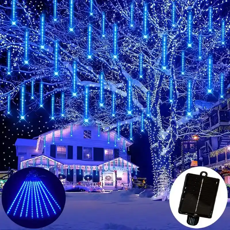 Set 8 Luces LED de Lluvia de Meteoritos 50 cm con Energía Solar Ilumina tus espacios exteriores con este set de 8 tubos LED tipo lluvia de meteoritos, cada uno de 50 cm, con un total de 300 luces LED en colores multicolores. Funcionan con panel solar, lo que permite una iluminación continua sin consumo eléctrico. Diseñadas para exteriores, estas luces son ideales para decoración navideña, terrazas, jardines, árboles y eventos nocturnos, aportando un efecto visual dinámico similar a una lluvia de estrellas. Su tecnología solar las hace un producto eco amigable, eficiente y de fácil instalación, incluso en lugares sin acceso a energía eléctrica. Especificaciones Nombre del producto: Luces lluvia de meteoritos solares Colores disponibles: Multicolor, azul, calida, blanca Forma: Tubo Longitud de cada tubo: 50 cm Total de tubos: 8 Total LED aproximado: 300 Alimentación: Solar Uso: Exterior Contenido del paquete 8 tubos LED lluvia de meteoritos 1 panel solar