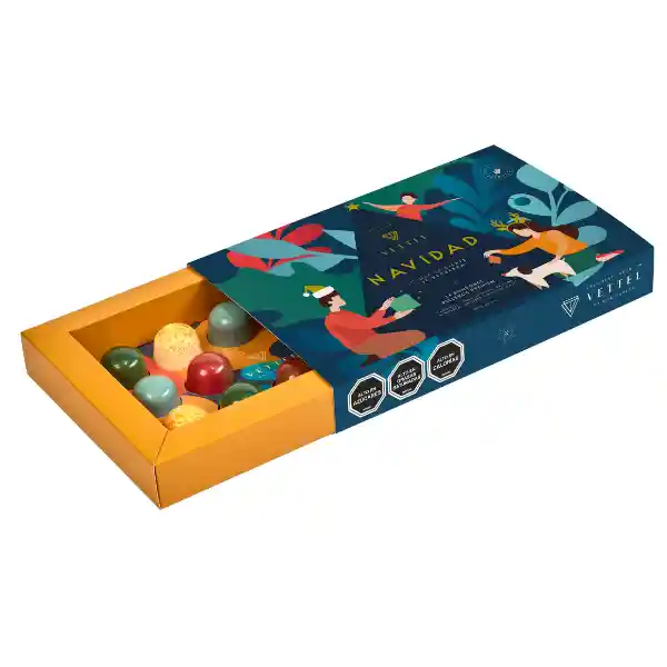 Deliciosa caja con bombones rellenos de chocolate belga blanco, leche y bitter. Incluye sabores festivos como cola de mono, praliné de almendra con jengibre, ganache caramelo y praliné de castañas de cajú. Perfecta para regalar o disfrutar en familia.