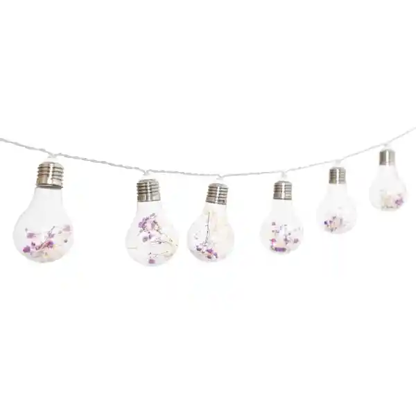 10 Ampolletas Decorativas Con Luces de Flor en su Interior. Utiliza 2 Baterías AA. Tiene un Largo de 21 Metros.