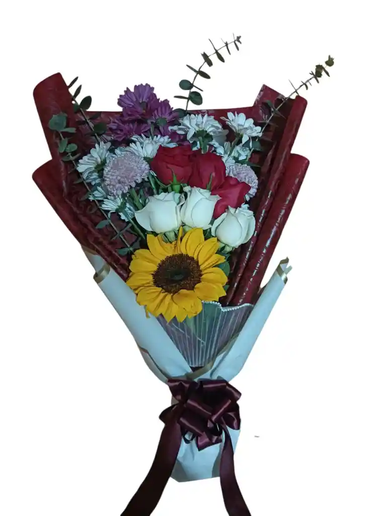 Ramo que combina la calidez del girasol con la elegancia de rosas y margaritas, creando un equilibrio entre ternura, pasión y armonía natural