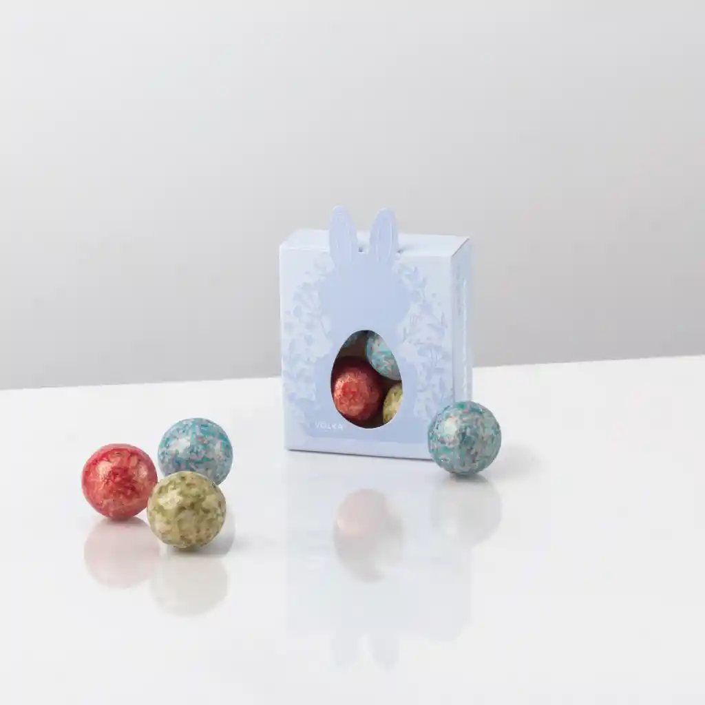 Huevitos de chocolate de leche y bitter, rellenos de praliné de avellanas y notas de caramelo. Un detalle dulc...Ver más
