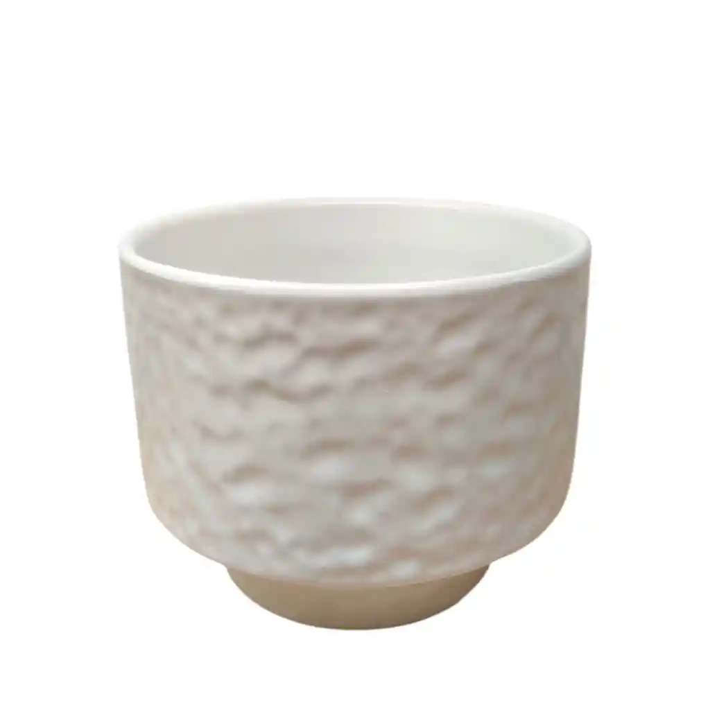 Añade un toque de estilo artesanal y moderno a tu hogar con esta versátil maceta de cerámica blanca. Su distintiva textura en relieve aporta una profundidad visual y un acabado sofisticado que captura la luz de manera única. Esta pieza es ideal para dar un realce sutil a tus plantas de interior en cualquier espacio, integrándose perfectamente en estilos minimalistas o rústicos modernos.