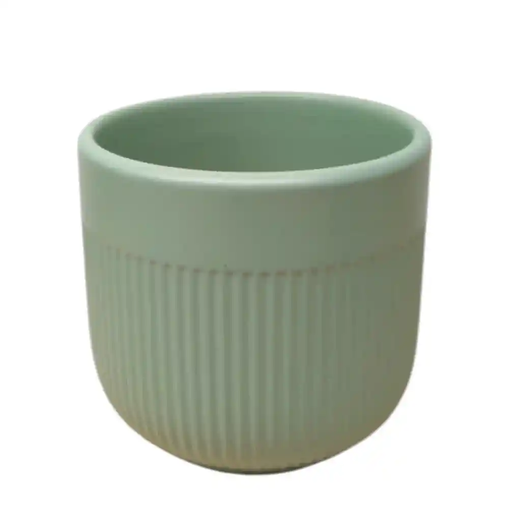 Añade un toque de frescura y modernidad a tu hogar u oficina con este elegante macetero de cerámica en tono verde menta. Su distintivo diseño estriado o acanalado aporta una textura visual única, perfecta para realzar la belleza de tus plantas favoritas, suculentas o flores. Es una pieza versátil que se integra armoniosamente en cualquier estilo decorativo, desde el minimalista hasta el nórdico.