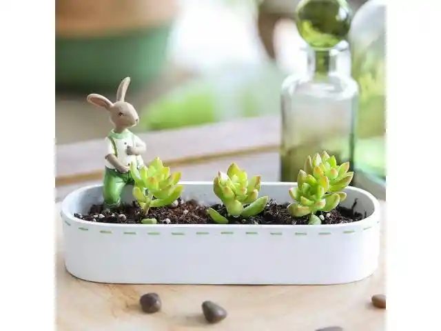 Un macetero ideal para esa planta tan especial que tienes en mente en esta temporada. Este simple y dulce macetero de resina, es un complemento increíble de la serie Green. Nuestro simpático conejo jardinero vestido de verde, está sentado al borde, dándole un toque muy chic. Además, los detalles verdes en los bordes lo terminan de complementar en su diseño. Ideal para plantas de pequeño tamaño, como las suculentas que están tan de moda.
