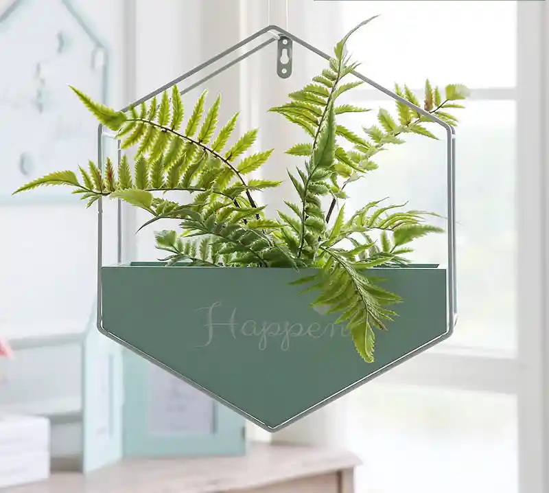Este es un lindo macetero de forma hexagonal. Una forma diferente y original para exhibir esa linda planta en tu casa. Puedes colgarlo a la pared o puedes dejarlo colgado libremente por una cuerda. El color menta lo hace fresco y veraniego. Su firme estructura metálica te da la seguridad de colgar todo lo que quieras.