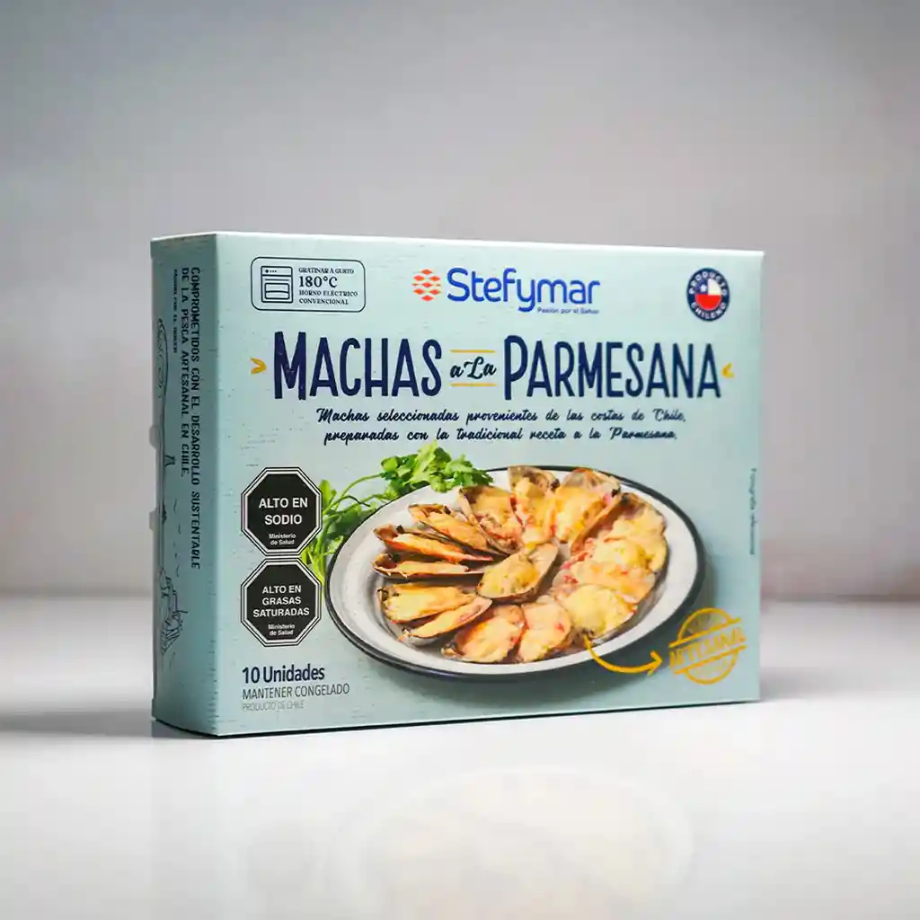 Machas a la Parmesana StefyMar Disfruta de la exquisitez de nuestras Machas a la Parmesana, listas para hornear y servir. Cada caja contiene 10 unidades de machas cuidadosamente preparadas con un delicioso gratinado de parmesano. Perfectas para una cena elegante o como un aperitivo sofisticado, estas machas son fáciles de preparar y ofrecen un sabor gourmet que encantará a tus invitados. Simplemente hornea a 180°C hasta que el queso esté dorado y burbujeante y disfruta con tu vino o aperitivo favorito.