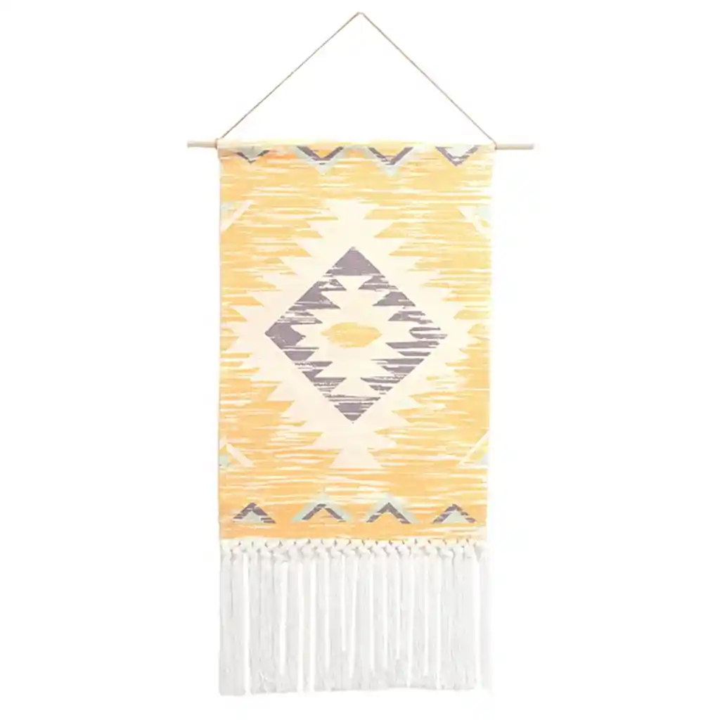 Este tapiz mural con diseño Geométrico es ideal para diferentes espacios de tu hogar como living, comedor, sala de estar, terraza o lugar de trabajo. Diseño: En tono amarillo con figuras geométricas que finaliza con borlas largas. Características: - Color: Amarillo, azul grisáceo, blanco, borlas blancas. - Patrón: Geométrica, estampado. - Material: 45% algodón + 45% poliéster + 10% viscosa. - Dimensiones: Largo: 60 cm, Ancho 40 cm. - Técnicas : Tejido a máquina; Borlas anudadas a mano. - Peso: 1 Kg.