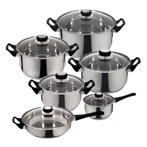 Fabricada en Acero Inoxidable de 0.4 Mm de Espesor, Fondo Termo Difusor en capsulado, Asas de Baquelita de Toque Frio Con Salva Llamas, Pulido de Espejo Interior y Exterior, Tapas de Vidrio Termo Resistentes Con Respiradero. Contiene Olla Con Tapa de 24 cm, Olla Con Tapa de 20 cm, Olla Con Tapa de 18 cm, Olla Con Tapa de 16 cm Cazo de 14 cm, Sartén Con Tapa 24 cm. Contiene 12 Piezas.