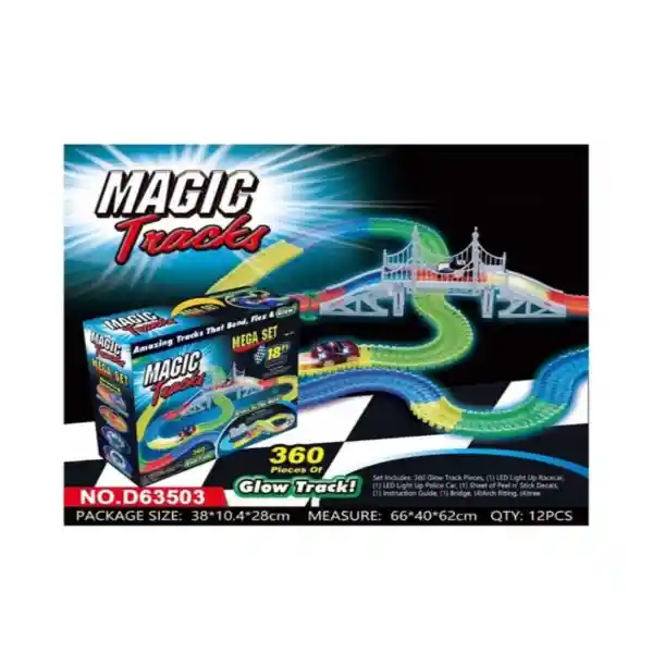 Contiene 360 Piezas. Increíble Pista Mágica Que Brilla en la Oscuridad y Luces Led: El Set Incluye: 360 Piezas de Pista Luminosa 1 Coche de Carreras Con Luz Led (Requiere 2 Baterías AA no Incluidas)1 Coche de Policía Con Luz Led (Requiere 2 Baterías AA no Incluidas) 1 Hoja de Stickers1 Guía de Instrucciones 1 Puente 4 Accesorio de Arco 4 Árbol.