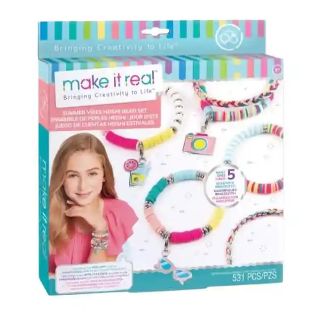 Aprenda a crear cinco pulseras con dijes de cuentas heishi con este kit de joyería de 531 piezas completo con una resistente estación de trabajo PlayTray. Incluye: 480 cuentas heishi, 35 cuentas plateadas, 1 cuerda elástica de 2 m, 1 anillo metálico grande, 1 pequeño anillo metálico, 1 broche de langosta con anillo de salto, 6 colores de hilo de bordar de 2 m. cada uno, 3 encantos, 1 enhebrador, 1 hoja de instrucciones, 1 bandeja de juego.
