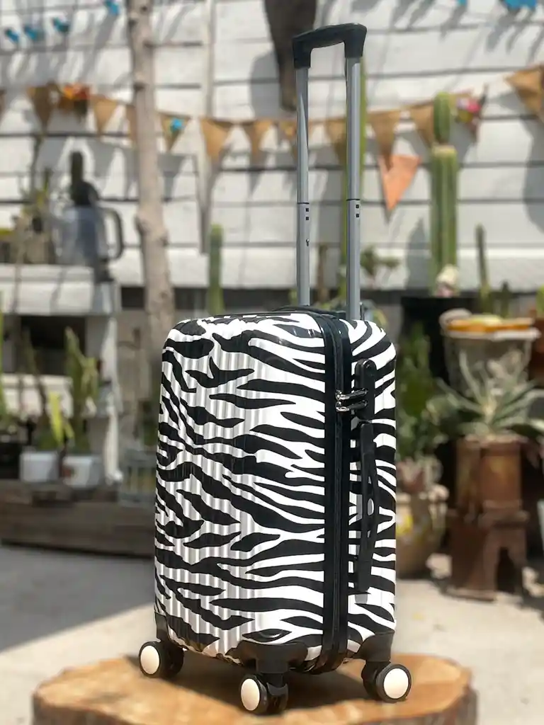 Maleta cabina carry on valija de mano estampado de cebra color blanco y negro. Las medidas de esta son las requeridas por LATAM, SKY y por la mayoria de las aerolineas. -Cuenta con 8 ruedas giratorias 360° -Resistente trolley de metal -Posee candado de combinacion numerica -El peso es de 2,2 KG -Medidas 55X34X23 -Medidas sin ruedas 49X34X23 -Capacidad de litros 38,3