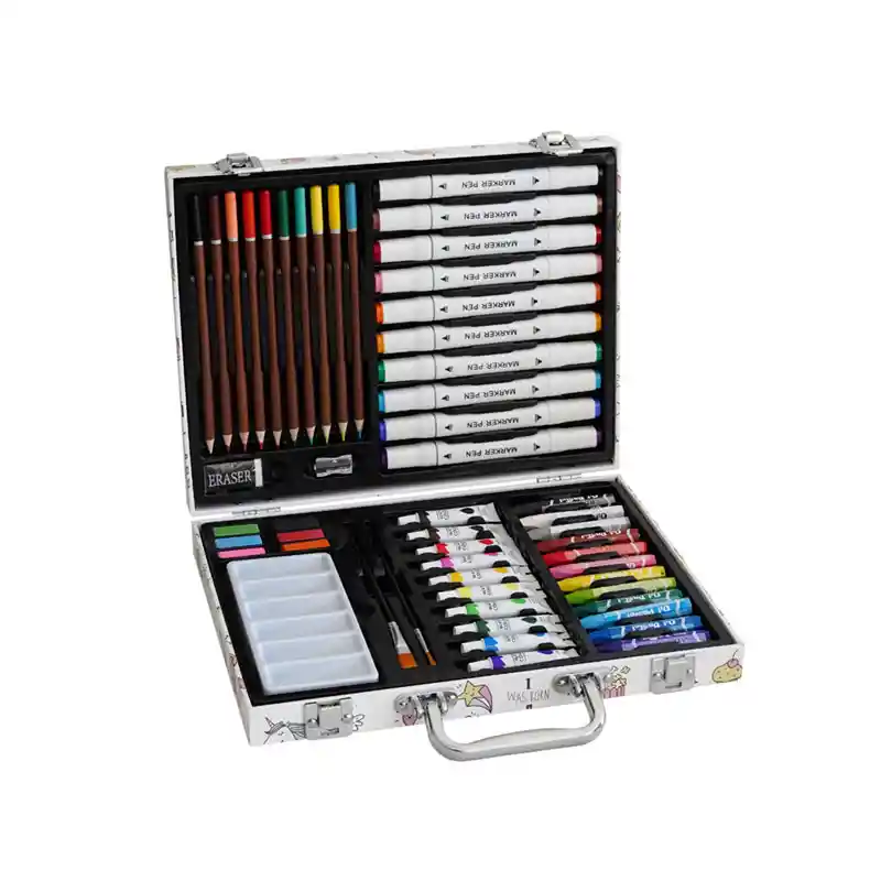 Ahora colorea todas tus imaginación y haz que todo tu trabajo aburrido se llene de colores. Es perfecto para los niños que quieren desarrollar su creatividad. Viene perfectamente embalado en una caja con un asa que facilita su transporte. ¡¿Entonces, Qué esperas?! ¡Anímate y mira a tus pequeños convertir su imaginación en realidad! CARACTERISTICAS: 12 Lápices de Cera 10 Marcadores 10 Temperas 10 Lápices de Colores Acuarela 6 colores 2 Pinceles 1 Sacapuntas 1 Goma de borrar 1 Paleta Hexagonal