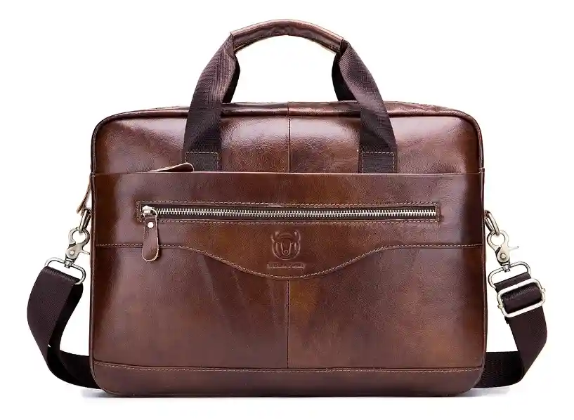 ¡Sofisticación y funcionalidad que te acomapaña! Maletín 100% cuero. Tu mejor y elegante compañero de trabajo. • Material exterior: Cuero • Material interior: Tela • 6 compartimientos de distintos tamaños • Correa de tela de alta resistencia ajustable • Medidas: 29 x 40,5 x 8,5 cm • Color: Café