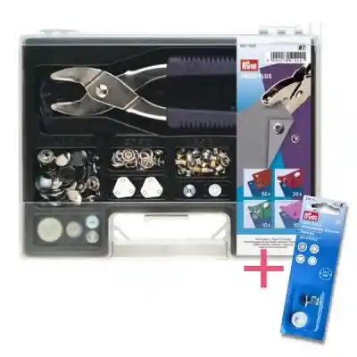 ¡Todo lo que necesita un hogar de costura bien surtido se puede encontrar aquí! La caja de surtido VARIO PLUS impresiona con su gama básica 6 en 1. INCLUYE LAS MATRICES y BROCHES PARA: Sacabocado de 3 y 4 mm. Snap metálico de 15 mm (Anorak: 10 plateados, 10 grafito). Broche Metálico 10 mm (Incluye 10 plateados). Ojetillo de 4 mm (Incluye 25 dorados, 25 plateados). Broche Camping (Incluye 10 plateados). Matriz para Broche/Snap Plástico de 12 mm.