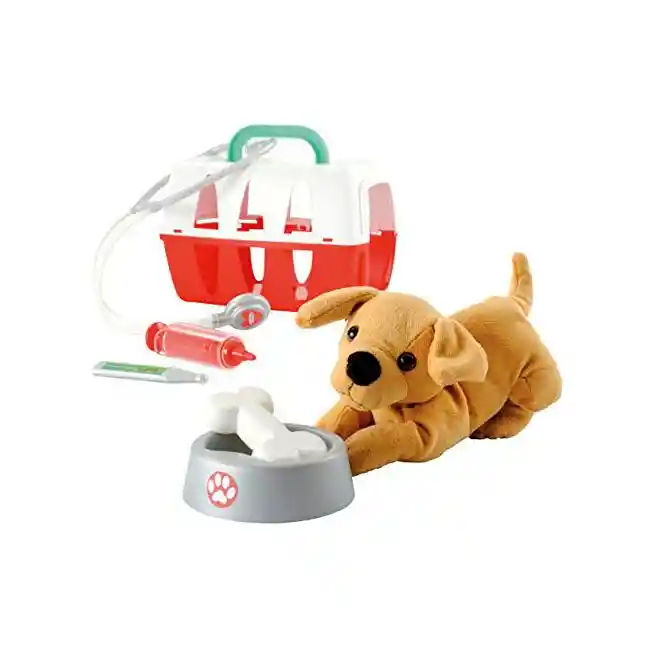 Completo set para jugar al veterinario y que invita al niño a cuidar a su mascota. Diseñado en estilo realista y a la vez de atractivos colores, contenido: 1 Maletín con asa de 23x15 cm, 1 Perrito de tela de 24x11 cm, 1 Plato de comida de 9x3 cm, 1 Estetoscopio de 40x13 cm, 1 Jeringa de 12x2 cm , 1 Porta jeringa transparente, 1 Huesito de 8x4 cm, 1 Termómetro de 10x2 cm Material: plástico de alta calidad según normativa de seguridad europea. Edad: 18+ meses. Fabricado en Francia por Ecoiffier.